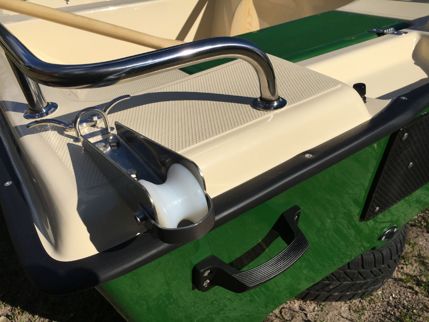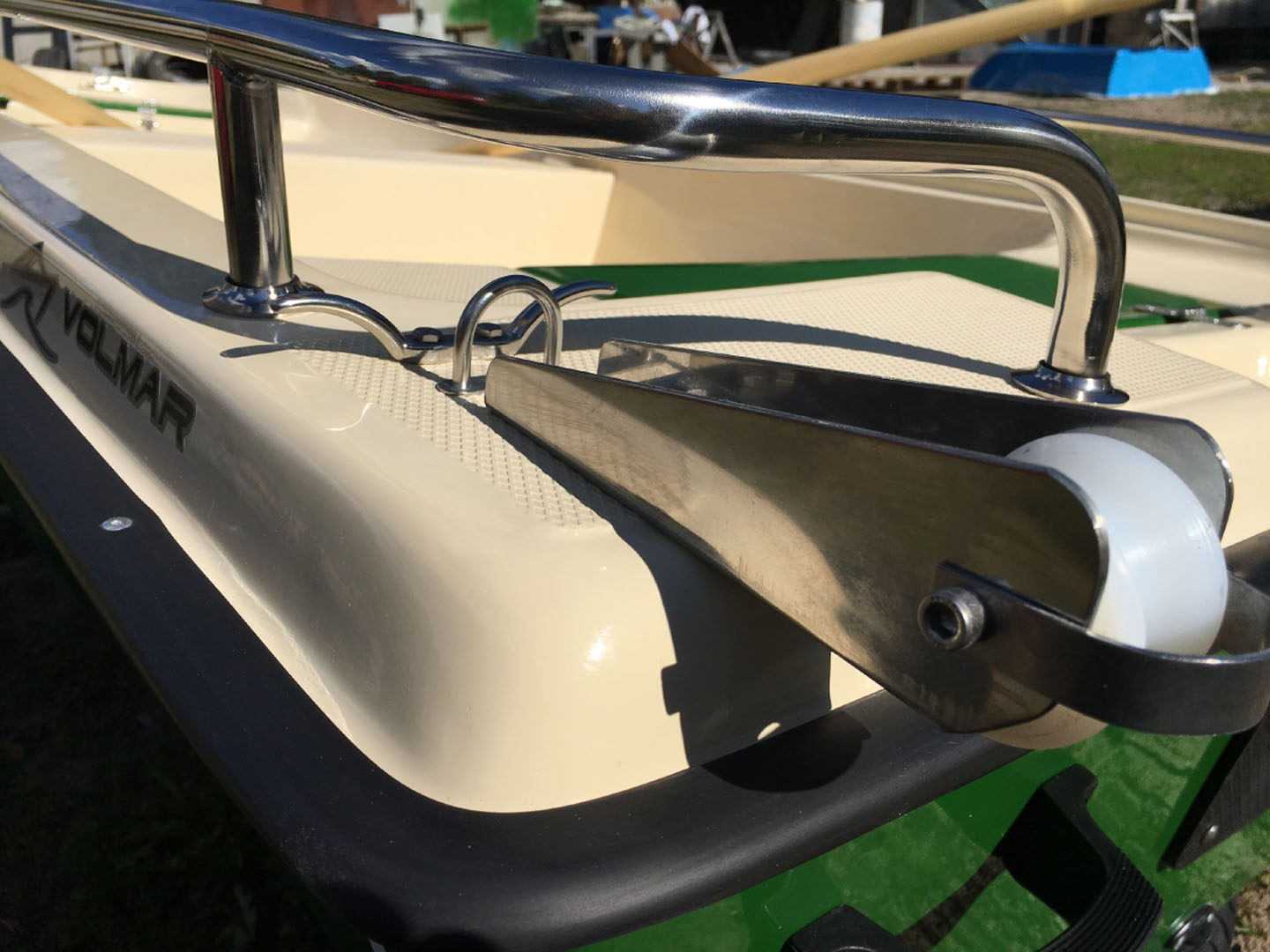 Zbliżenie na metalowe elementy i uchwyty łodzi Wydra 300, z widocznym logo VOLMAR na burcie.