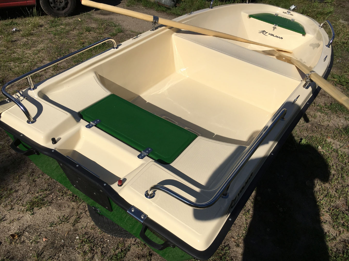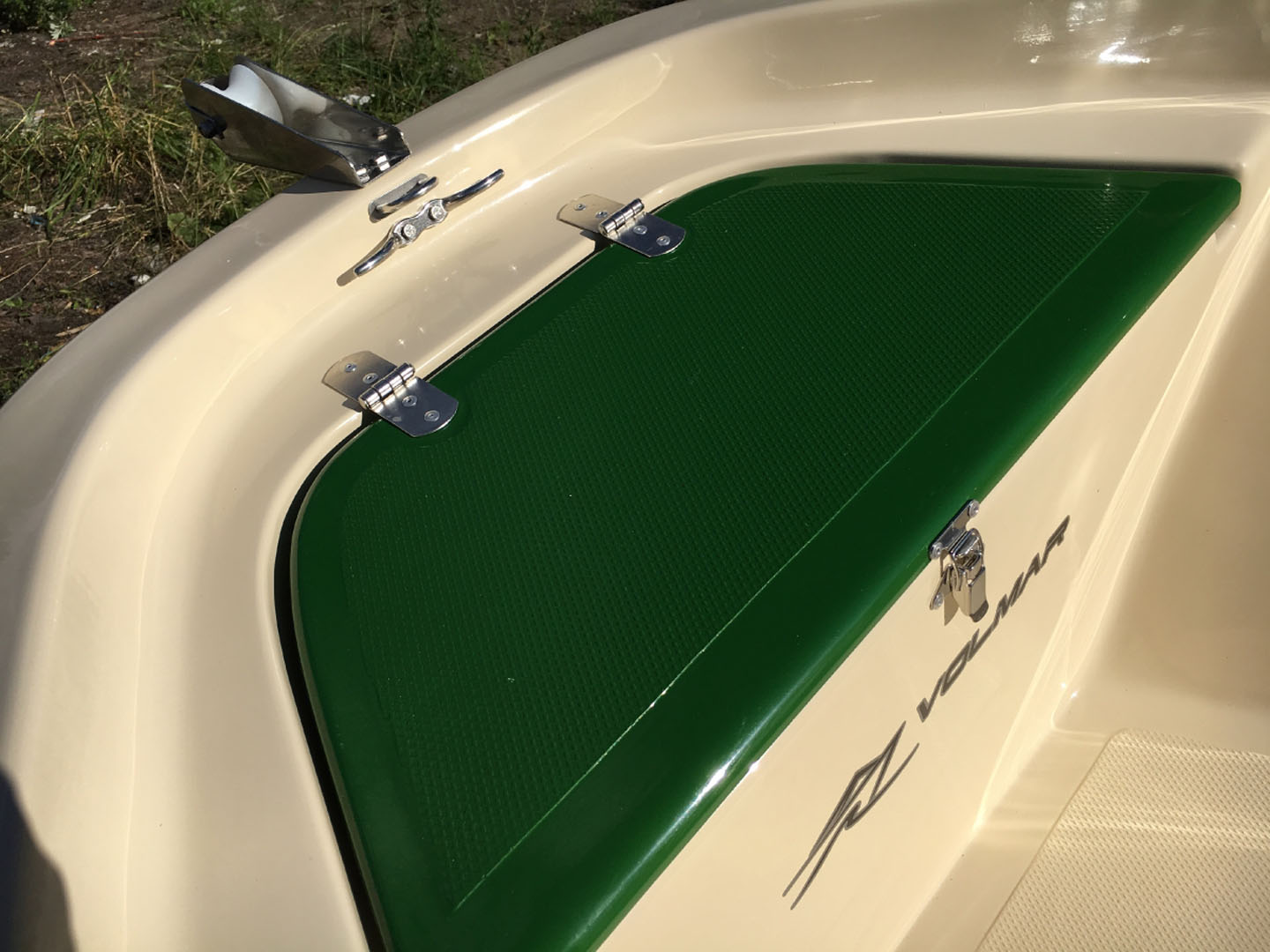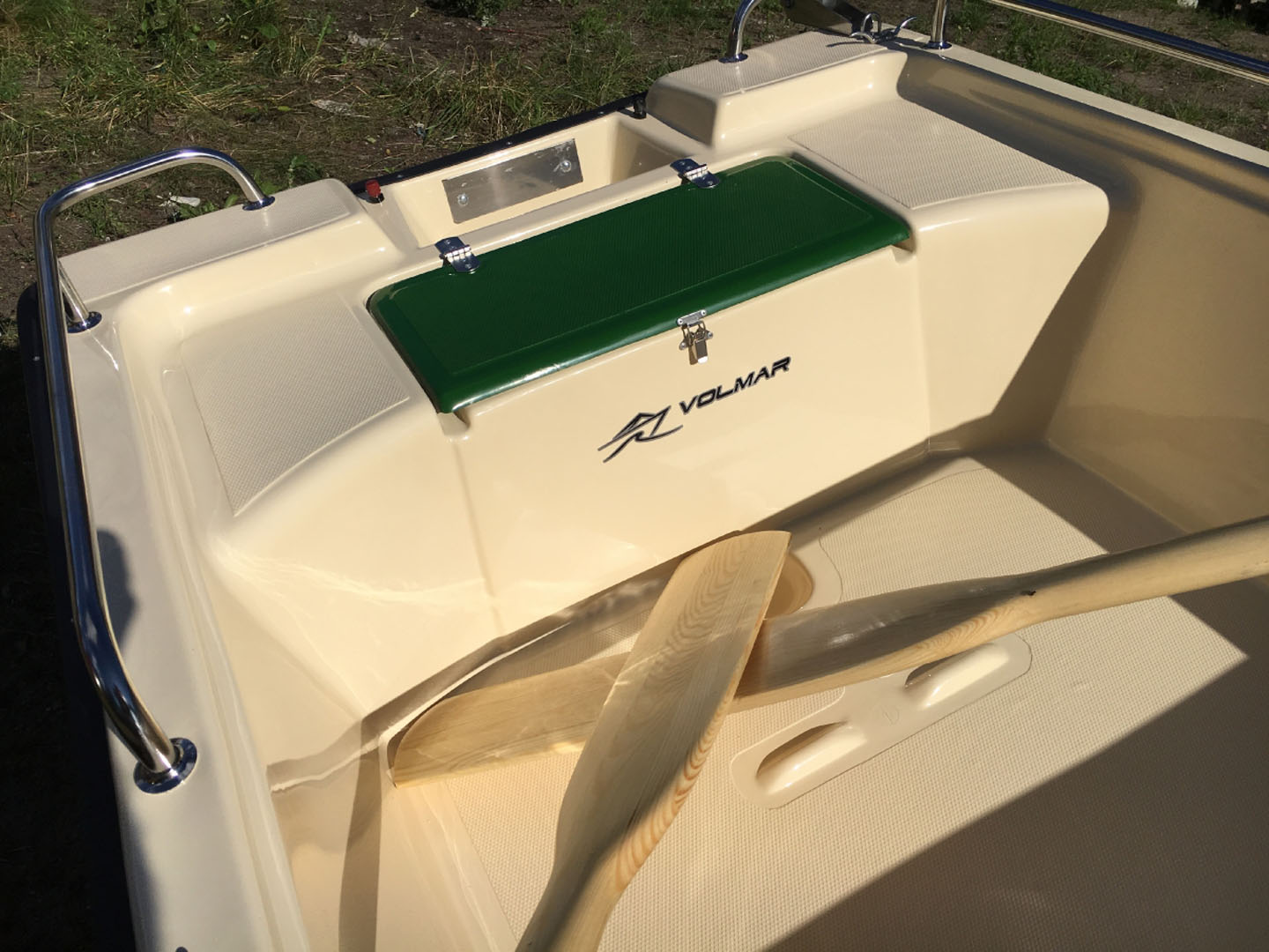 Na zdjęciu znajduje się wnętrze łodzi "Wydra 300" marki Volmar, z zielonym pokrywanym schowkiem oraz wiosłem leżącym na podłodze.
