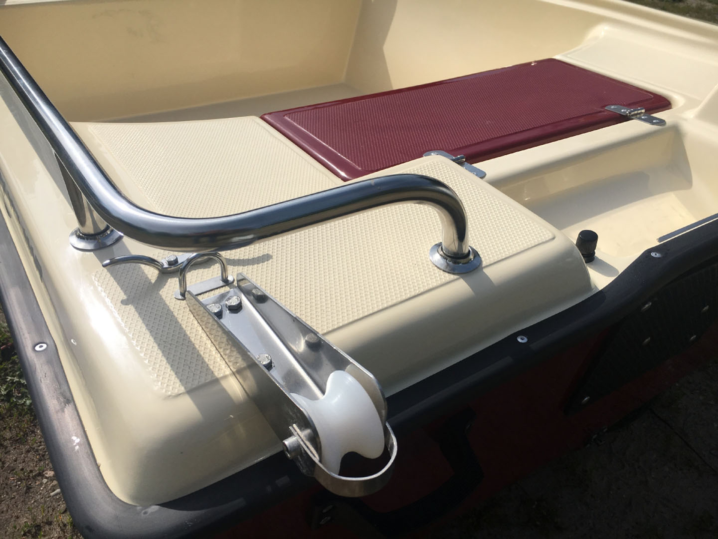 Zdjęcie przedstawia wnętrze łodzi Wydra 300 z widokiem na część pokładu oraz uchwyt metalowy.