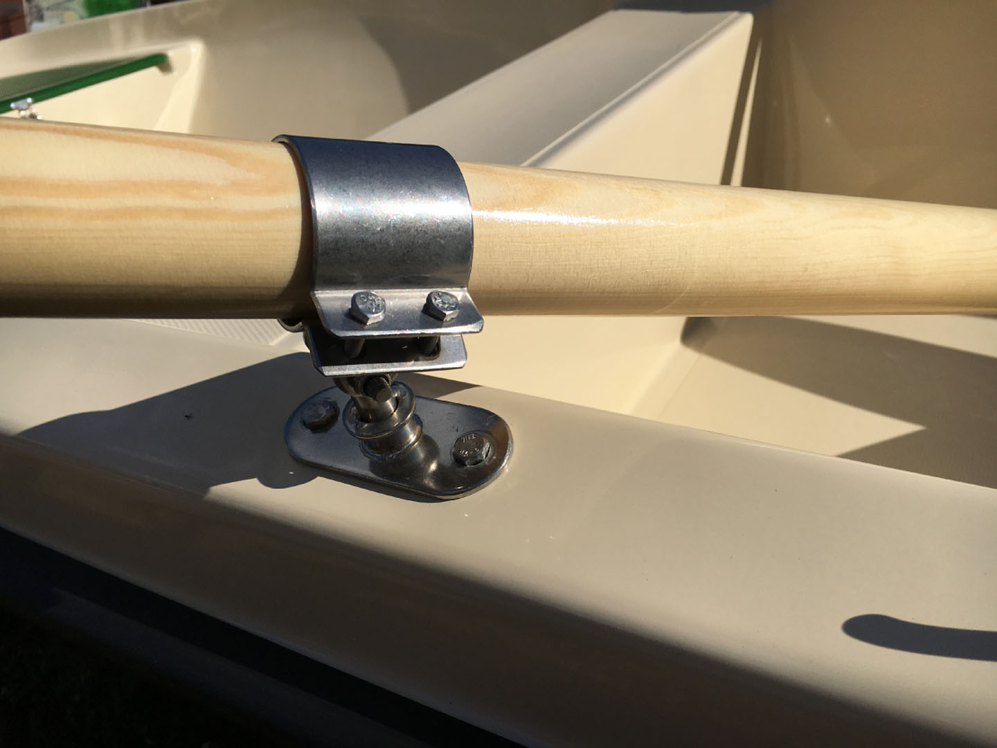 Zdjęcie przedstawia detal metalowego mocowania wiosła na stylowej łodzi Wydra 300.