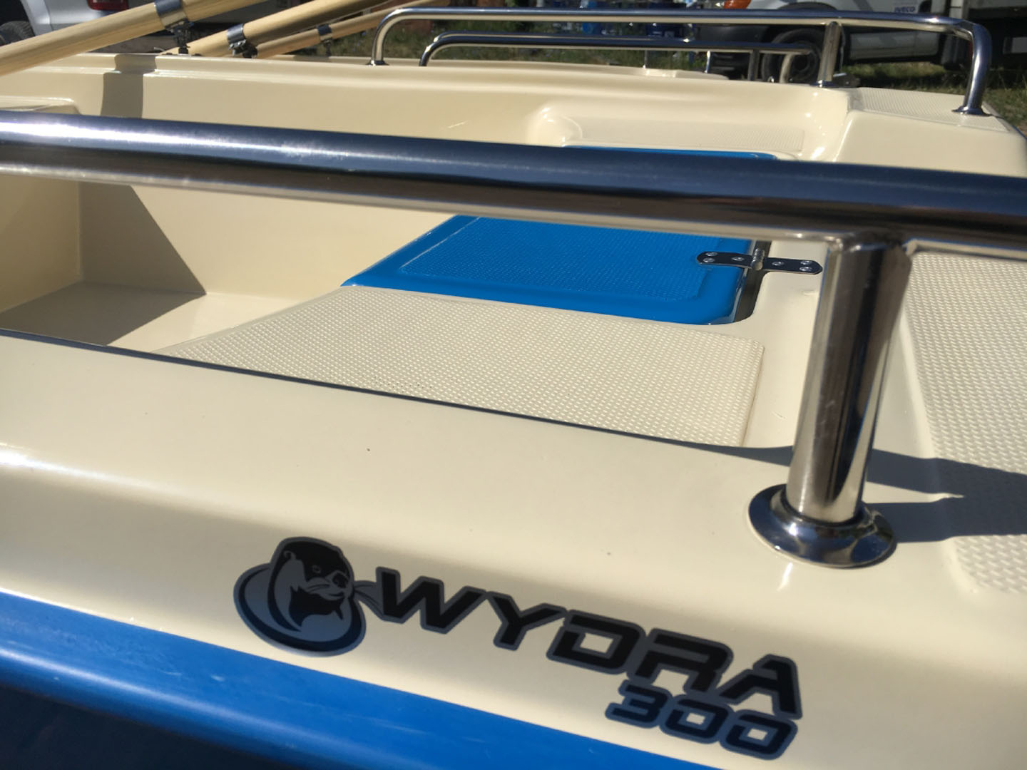 Zdjęcie przedstawia wnętrze łodzi modelu Wydra 300, z widocznym niebieskim siedziskiem oraz metalowymi elementami wykończeniowymi.