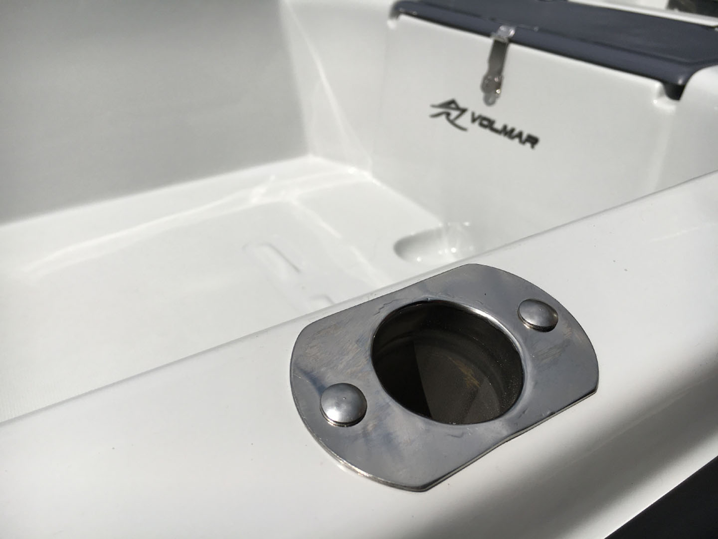 Zdjęcie przedstawia wnętrze łodzi Wydra 300, z widocznym metalowym uchwytem oraz logo producenta VOLMAR.