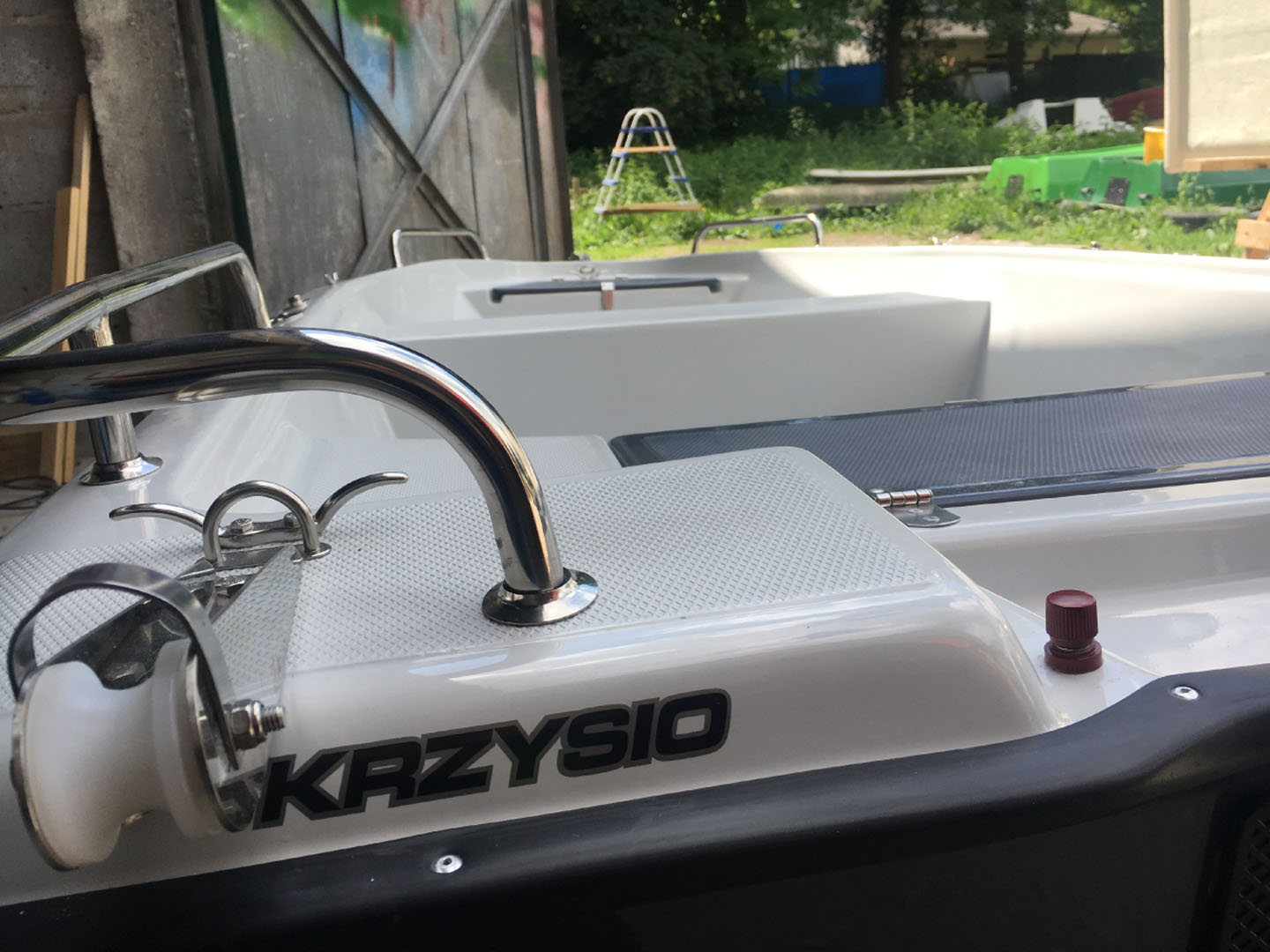 Zdjęcie przedstawia detal wnętrza łodzi o nazwie "Krzysio", ukazujący srebrne uchwyty i elementy sprzętu na tle otoczenia.